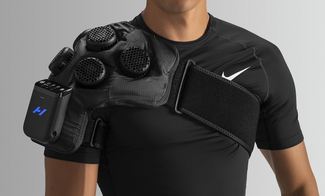 Electronic heating, cooling, and contrast shoulder device with compression for warm up and recovery.